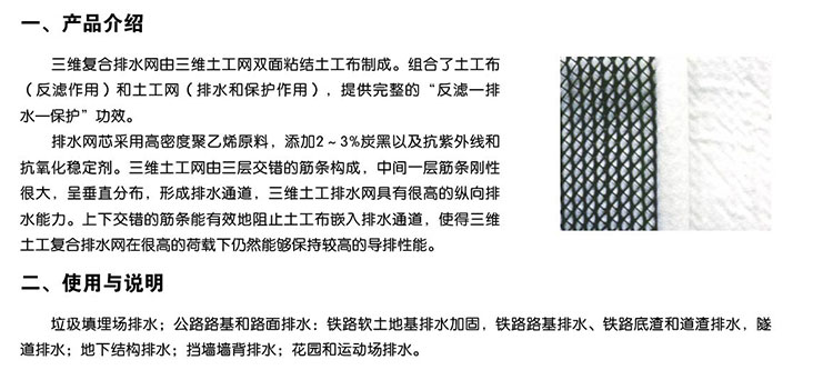 三維復合排水網(wǎng)是一種新型的排水土工材料。以高密度聚乙烯(HDPE)為原料,經(jīng)特殊的擠出成型工藝加工而成,具有三層特殊結構。中間筋條剛性大,縱向排列,形成排水通道,上下交叉排列的筋條形成支撐防止土工布嵌入排水通道,即使在很高的荷載下也能保持很高的排水性能。雙面粘接滲水土工布復合使用,具有“反濾--排水--透氣--保護”綜合性能,是目前理想的排水材料。