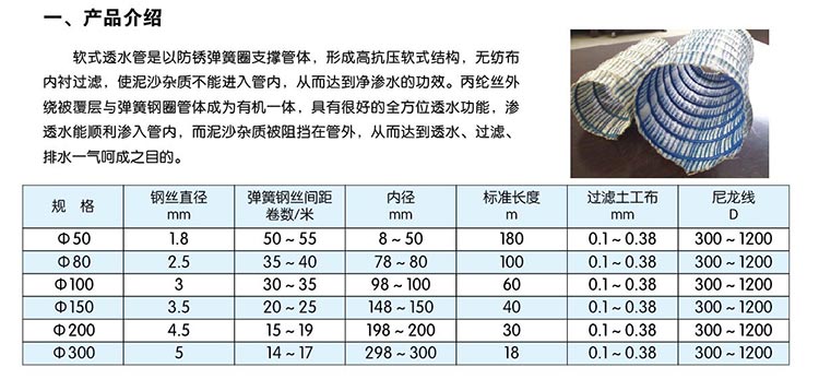 透水管是以防銹彈簧圈支撐管體,形成高抗壓軟式結構,無紡布內(nèi)襯過濾,使泥砂雜質(zhì)不能進入管內(nèi),從而達到凈滲水的功能。滌綸絲外繞祉覆層具有優(yōu)良吸水性,能迅速收集土體中多余水份。橡膠筋使管壁被覆層與彈簧鋼圈管體成為有機一體,具有很好的透水功能,滲透水順利滲入管內(nèi),而泥砂雜質(zhì)被阻擋在管外,從而達到透水、過濾、排水一氣呵成之目的。