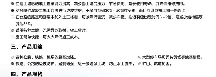 該產(chǎn)品適用于修建公路、鐵路以及江河湖海岸邊的加筋檔土墻、堤壩、橋面、陡坡及土工格室等工程。其作用是可提土墻或堤壩的承載力,延長(zhǎng)使用壽命,減少占地面積,縮短工期,降低造價(jià),減小維修費(fèi)用。
